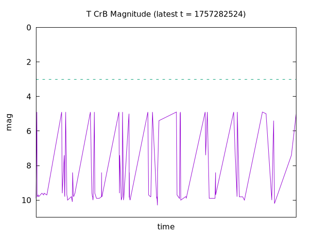 T Coronae Borealis is a dual-star system, consisting of a large cool red giant and a small hot white dwarf. The white dwarf siphons material from the red giant and grows. When it reaches critical mass, it explodes in a celestial event called a 'nova.' This is the cause of the increase in brightness that we see. When the nova erupts, the line above will shoot up from magnitude 10 to magnitude 2 or 1. We'll then know to go outside and see it for ourselves!